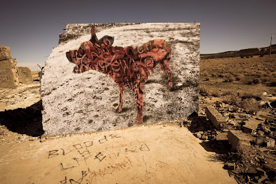 Over the years I've pasted it 3 times on J R's house. Roa painted 2 sleeping foxes and a sleeping rabbit in August of 2012. I was saddened about a year ago when I noticed that one of the doors to the house had been opened (as the house remained solidly boarded up for years). I talked with the owner (J R), who said thieves had broken in and stole household items he'd stored inside. I apologized feeling that art on the house attracted the thieves to it. He dismissed the thievery saying it was okay. He didn't think the theft occurred because his house was painted.
